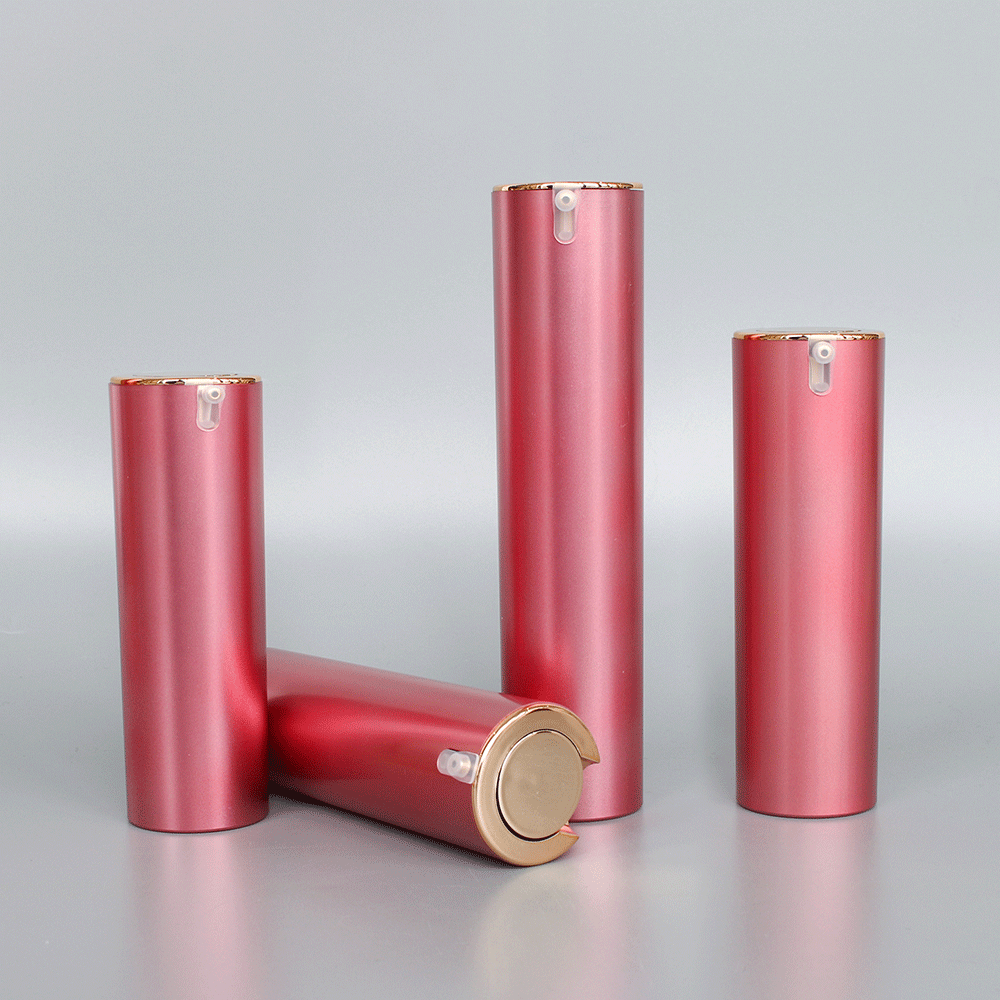 Cylindrical Cosmetic Airless Bottle. The pump has a special shape like an upside down wine glass.