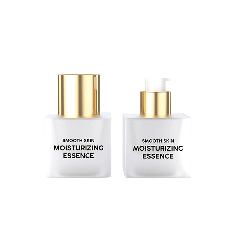 Glass Lotion Bottle With Small Shape. The bottle is Low square shape and the collar is golden and cap.