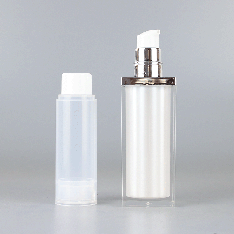 Refillable Skincare Packaging With Silver Collar. The outer of the bottle is square in shape and the transparent is in color.